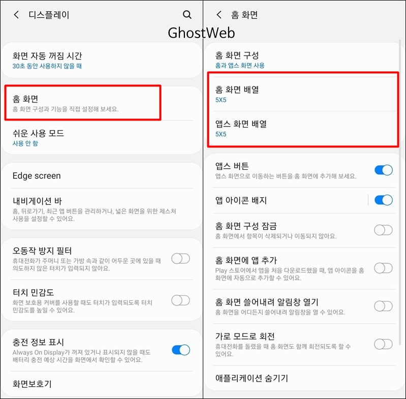 배열 변경을 위해 먼저 <설정> - <디스플레이> - <홈 화면> 순으로 이동하세요.