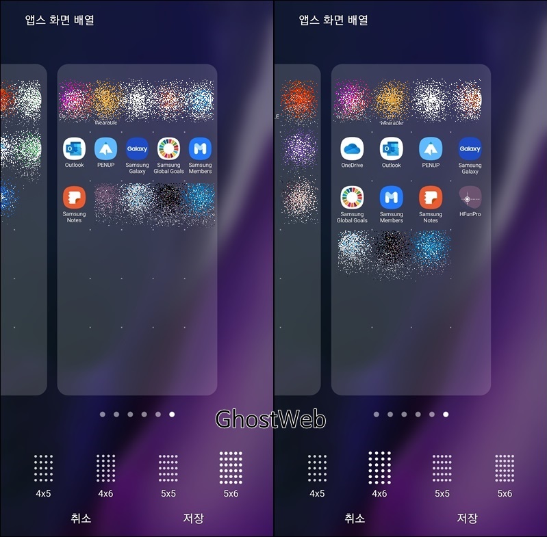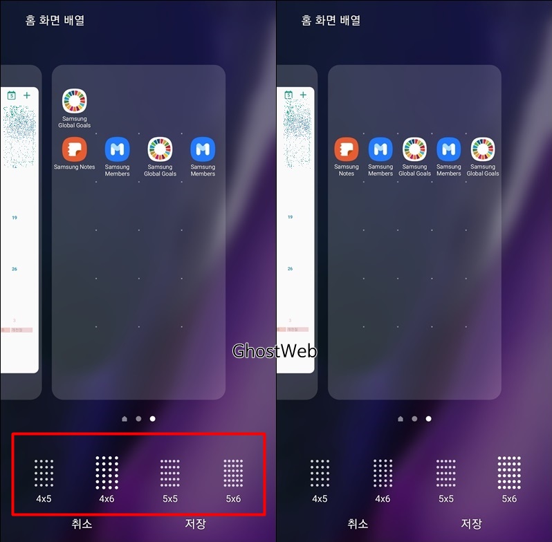 갤럭시 노트 20의 경우 4x5, 4x6, 5x5, 5x6 배열로 사용할 수 있는데 숫자가 클수록 많은 앱 아이콘, 위젯을 배치할 수 있어요.