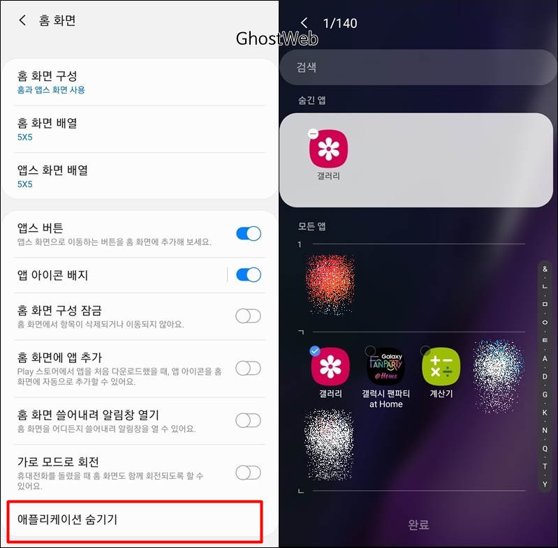 애플리케이션 숨기기는 앱스 목록, 홈 화면에 해당 앱을 표시하지 않도록 하는 설정이에요.