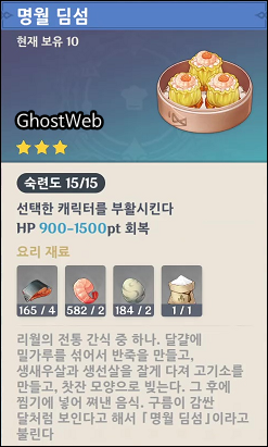 명월 딤섬 (생선 살코기 4, 생새우살 2, 새알 2, 밀가루 1) 선택한 캐릭터를 부활. HP 900~1500pt 회복. 레시피 구매 : 리월항 신월헌 월소 (5000 모라) |