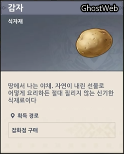 감자 획득 경로 : 잡화점 구매 (몬드 잡화점 블랑키, 리월항 영발 상점 동승, 리월항 상인 창순) 요리/식자재 : 만족 샐러드, 몬드 감자전, 바삭 쉬림프 카나페, 황금 새우볼, 촉촉 으깬 감자, 바위항 지삼선, 높이 쌓기 |