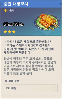 중원 내장꼬치 (짐승고기 3, 생선 살코기 3, 밀가루 3, 소금 2) 파티 내 모든 캐릭터의 등반/대시 시 소모하는 스태미나 15%~25% 감소. 지속 시간 : 900초 다인모드 시 자신의 캐릭터에만 적용. |