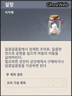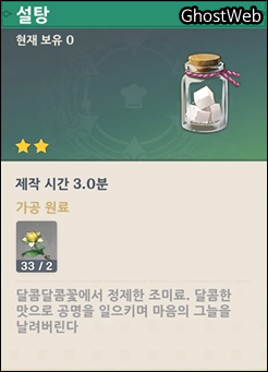 설탕 획득 경로 : 요리 가공 획득 (달콤달콤 꽃 2) 음식 : 행인두부, 허브 젤리, 탕수어, 천추육, 연꽃 파이, 연밥 계란찜, 허니캐럿그릴 |