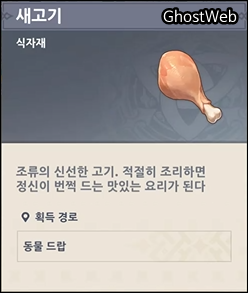 새고기 획득 경로 : 동물 드랍 요리/식자재 : 버섯 닭꼬치, 달콤달콤 닭고기, 스튜훈제 닭고기, 바삭바삭 치킨버거, 황금 크리스피 치키, 고기죽순데침 |