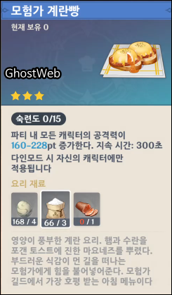 모험가 계란빵 (새알 4, 밀가루 3, 햄 1) 파티 내 모든 캐릭터의 공격력이 160~228pt 증가 지속 시간 : 300초 다인모드 시 자신의 캐릭터에만 적용 |