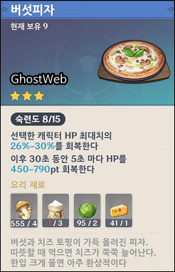 버섯피자 (버섯 4, 밀가루 3, 양배추 2, 치즈 1) 선택한 캐릭터 HP 최대치의 26%~30%를 회복. 이후 30초 동안 5초 마다 HP를 450~790pt 회복. |