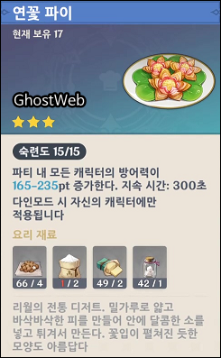 연꽃 파이 (행인 4, 밀가루 2, 버터 2, 설탕 1) 파티 내 모든 캐릭터의 방어력이 165~235pt 증가. 지속 시간 : 300초 |