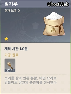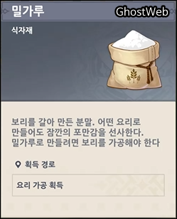 밀가루 획득 경로 : 요리 가공 획득 판매 : 리월항 만민당 묘 사부 음식 : 불꽃 미트 스파게티, 버섯피자, 탕수어, 바삭바삭 치킨버거, 모라육, 장원 팬케익, 황금 새우볼, 명월 딤섬, 무완자 튀김, 모험가 계란빵, 버터 송이구이, 황금 크리스피 치킨, 어부 토스트, 연꽃 파이, 달빛 파이, 골든크랩, 산미 울면, 중원 내장꼬치 |