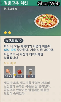 절운고추 치킨 (새고기 2, 절운고추 1, 후추 1) 파티 내 모든 캐릭터의 치명타 확률이 6%~12% 증가 지속 시간 : 300초 다인모드 시 자신의 캐릭터에만 적용 레시피 구매 : 리월항 만민당 묘 사부 (2250 모라) |