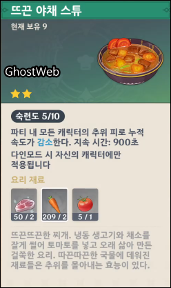 뜨근 야채 스튜 (냉동 생고기 2, 당근 2, 토마토 1) 파티 내 모든 캐릭터의 추위 피로 누적 속도가 감소한다. 지속 시간 : 900초다인모드 시 자신의 캐릭터에만 적용 |
