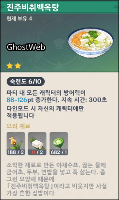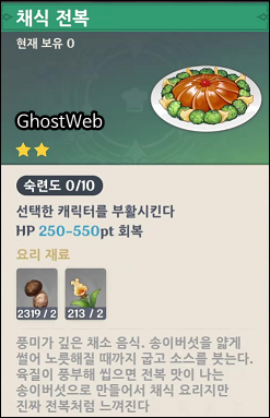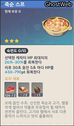 죽순 스프 (짐승 고기 2, 햄 2, 죽순 1) 선택한 캐릭터 HP 최대치의 26%~30%를 회복 이후 30초 동안 5초 마다 HP를 450~790pt 회복 |