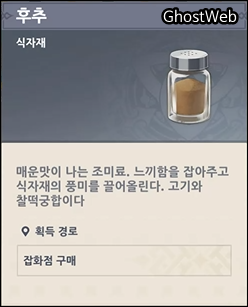 후추 획득 경로 : 잡화점 구매 (몬드 잡화점 블랑키, 리월항 영발 상점 동승) 음식 : 홀호어 구이, 북극 사과고기찜, 몬드 생선구이, 무완자 튀김, 촉촉 으깬 감자, 황금 크리스피 치킨, 절운고추 치킨, 훈제고기 볶음 |