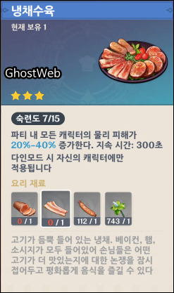냉채수육 (햄 1, 베이컨 1, 소시지 1, 허브 1) 파티 내 모든 캐릭터의 물리 피해가 20%~40% 증가 지속 시간 : 300초 다인모드 시 자신의 캐릭터에만 적용 |