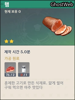 햄 획득 경로 : 요리 가공 획득 (짐승고기 2, 소금 1) 음식 : 죽순 스프, 꽃게알 야채찜, 모험가 계란빵, 비옥야채쌈, 선도장, 냉채수육, 절운 누룽지, 고기죽순데침, 훈제고기 볶음 |