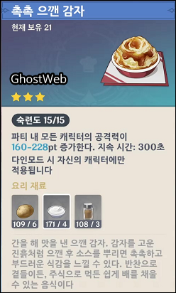 촉촉 으깬 감자 (감자 6, 크림 4 , 후추 3) 파티 내 모든 캐릭터의 공격력이 160~228pt 증가. 지속 시간 : 300초 다인모드 시 자신의 캐릭터에만 적용. |