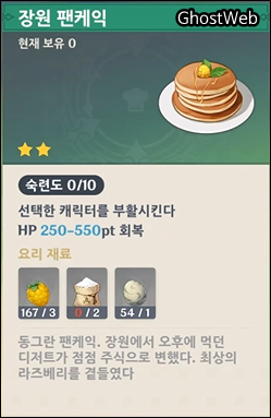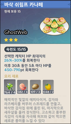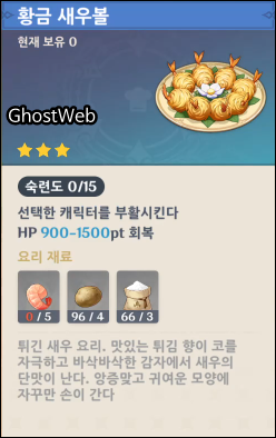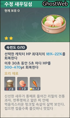 수정 새우딤섬 (쌀 3, 생새우살 3, 당근 2) 선택한 캐릭터 HP 최대치의 18%~22%를 회복 이후 30초 동안 5초 마다 HP를 300~470pt 회복 레시피 구매 : 리월항 만민당 묘 사부 (2250 모라) |