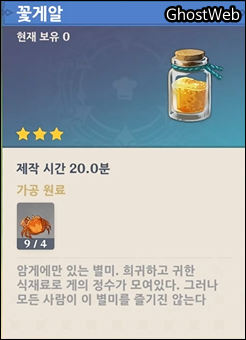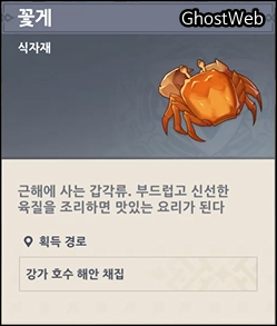 꽃게 획득 경로 : 강가 호수 해안 채집 판매 : 리월항 만민당 묘 사부 음식 : 선도장, 꽃게알, 꽃게알 두부, 꽃게알 야채찜, 통통 연꽃 해산물 수프, 골든크랩 |