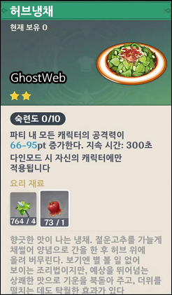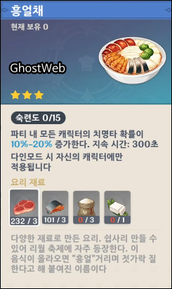 흥얼채 (짐승고기 3, 생선 살코기 3, 쌀 3, 두부 1) 파티 내 모든 캐릭터의 치명타 확률이 10%~20% 증가. 지속 시간 : 300초 다인모드 시 자신의 캐릭터에만 적용. 레시피 구매 : 리월항 만민당 묘 사부 (4500 모라) |
