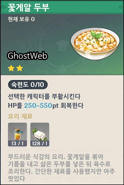 꽃게알 두부 (꽃게알 1, 두부 1) 선택한 캐릭터를 부활. HP 250~550pt 회복. 레시피 구매 : 리월항 만민당 묘 사부 (2250 모라) |
