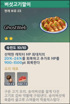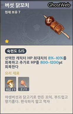 버섯 닭꼬치 (야생 버섯 1, 새고기 1) 선택한 캐릭터 HP 최대치의 8% ~ 10%를 회복 추가로 HP 800~1200pt 회복 |