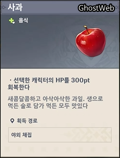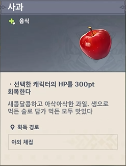 사과 선택한 캐릭터의 HP를 300pt 회복 |