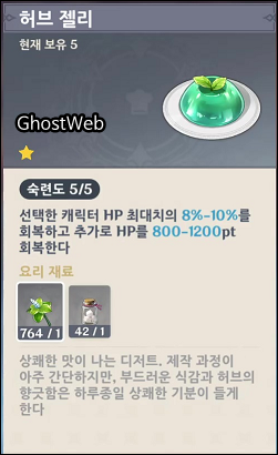 허브 젤리 (허브 1, 설탕 1) 선택한 캐릭터 HP 최대치의 8% ~ 10%를 회복. 추가로 HP 800 ~ 1200pt 회복. 레시피 구매 : 몬드성 디어 헌터 사라 (2250 모라) |