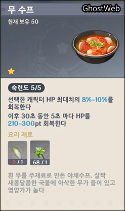 무 수프 (흰 무 1, 허브 1) 선택한 캐릭터 HP 최대치의 8%~10%를 회복한다. 이후 30초 동안 5초 마다 HP를 210~300pt 회복 |