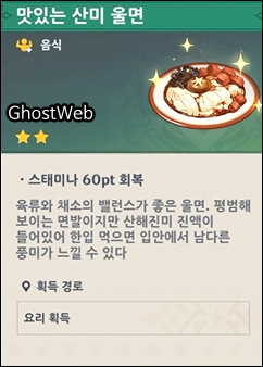 산미 울면 (버섯 3, 짐승 고기 2, 밀가루 2) 스태미나 40~60pt 회복 레시피 구매 : 경책 산장 소백 (2500 모라) |
