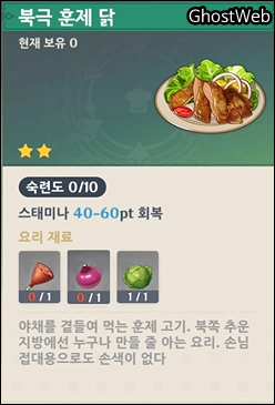 북극 훈제닭 (훈제한 닭고기 1, 양파 1, 양배추 1) 스태미나 40~60pt 회복 |