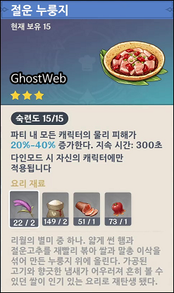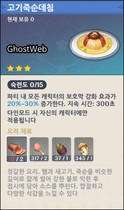 | [원신] 요리 제작 팁 (캐릭터 별 보너스 받기) (0) | 2020.11.08 |