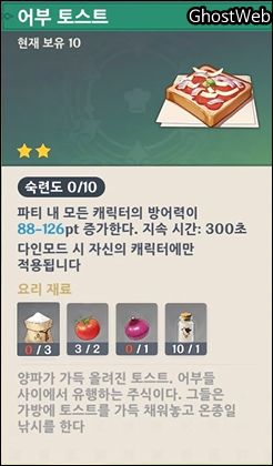 어부 토스트 (밀가루 3, 토마토 2, 양파 1, 우유 1) 파티 내 모든 캐릭터의 방어력이 88~126pt 증가 지속 시간 : 300초 다인모드 시 자신의 캐릭터에만 적용. |