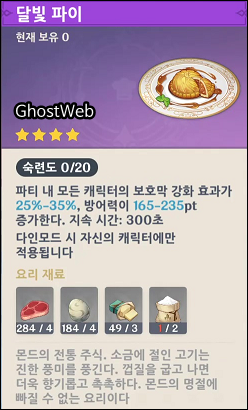 달빛 파이 (짐승고기 4, 새알 4, 버터 3, 밀가루 2) 파티 내 모든 캐릭터의 보호막 강화 효과가 25%~35% 증가. 방어력이 165~235pt 증가. 지속 시간 : 300초 다인모드 시 자신의 캐릭터에만 적용. |