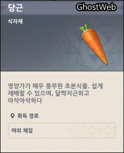 당근 획득 경로 : 야외 채집 판매 : 리월항 만민당 묘 사부 음식 : 수정 새우딤섬, 세계 평화, 허니캐럿그릴, 뜨끈 야채 스튜 채집 위치 정리 : https://ghostweb.tistory.com/1130 |