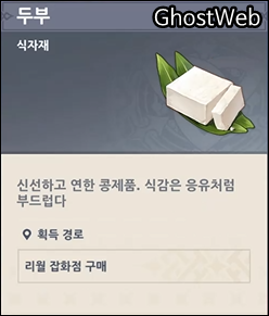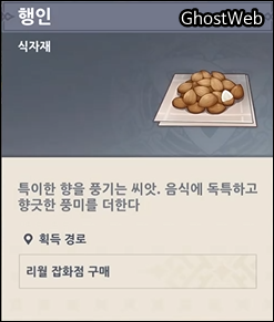 행인 획득 경로 : 리월 잡화점 구매 (리월항 영발 상점 동승) 음식 : 행인두부, 연꽃 파이 |