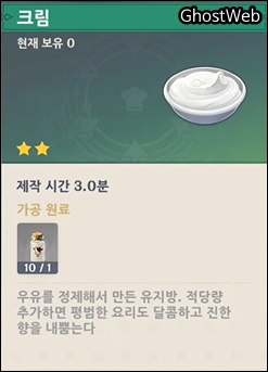 크림 우유(1) : 잡화점 구매 판매 : 몬드성 디어헌터 사라 음식 : 꽃게알 야채찜, 촉촉 으깬 감자, 크림 스튜 |