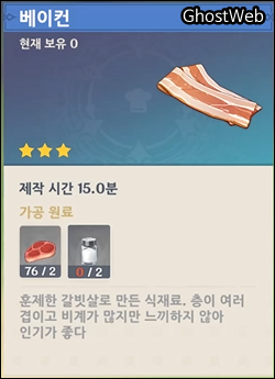 베이컨 획득 경로 : 식자재 가공 (짐승 공기 2, 소금 2) 음식 : 냉채수육 |