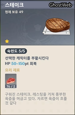 스테이크 (짐승 고기 2) 선택한 캐릭터를 부활 HP 50~150pt 회복 |