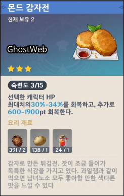 몬드 감자전 (솔방울 2, 감자 1, 과일잼 1) 선택한 캐릭터 HP 최대치의 30%~34%를 회복. 추가로 600~1900pt 회복. |