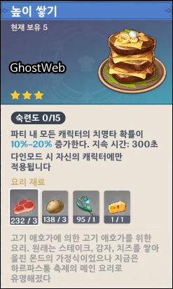 높이 쌓기 (짐승고기 3, 감자 3, 등불꽃 1, 치즈 1) 파티 내 모든 캐릭터의 치명타 확률이 10%~20% 증가. 지속 시간 : 300초 다인모드 시 자신의 캐릭터에만 적용. 레시피 구매 : 몬드성 디어 헌터 사라 (4500 모라) |