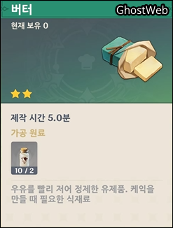 버터 우유(2) : 잡화점 구매 판매 : 몬드성 디어헌터 사라 음식 : 북극 사과고기찜, 바삭바삭 치킨버거, 버터 송이구이, 황금 크리스피 치킨, 연꽃 파이, 버터 생선 구이, 달빛 파이 |