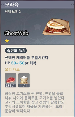 모라육 (짐승고기 1, 밀가루 1) 선택한 캐릭터를 부활. HP 50~150pt 회복. |