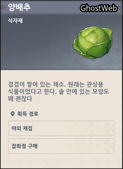 양배추 획득 경로 : 야외 채집, 잡화점 구매(몬드 잡화점 블랑키, 리월항 영발 상점 동승) 음식 : 북극 훈제닭, 만족 샐러드, 비옥야채쌈, 버섯피자, 바삭바삭 치킨버거, 꽃게알 야채찜, 경책 가정식 |