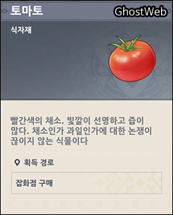 토마토 획득 경로 : 잡화점 구매 (몬드 잡화점 블랑키, 리월항 영발 상점 동승) 음식 : 불꽃 미트 스파게티, 어부 토스트, 탕수어, 뜨끈 야채 스튜 |