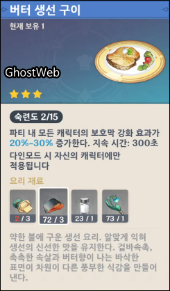 버터 생선 구이 (버터 3, 생선 살코기 3, 소금 1, 등불꽃 1) 파티 내 모든 캐릭터의 보호막 강화 효과가 20%~30% 증가 지속 시간 : 300초 다인모드 시 자신의 캐릭터에만 적용. |