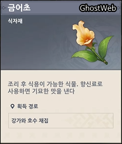금어초 획득 경로 : 강가와 호수 요리/식자재 : 크림 스튜, 생선 볶음면, 채식 전복, 진주비취백옥탕, 훈제고기 볶음 채집 위치 정리 : https://ghostweb.tistory.com/1123 |