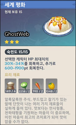 세계 평화 (쌀 4, 연꽃받침 2, 당근 2, 라즈베리 2) 선택한 캐릭터 HP 최대치의 30%~34% 회복. 이후 30초 동안 5초 마다 HP를 600~1900pt 회복. 레시피 구매 : 리월항 만민당 묘 사부 (4500 모라) |