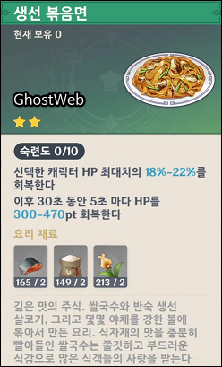 생선 볶음면 (생선 살코기 2, 쌀 2, 금어초 2) 선택한 캐릭터 HP 최대치의 18%~22%를 회복. 이후 30초 동안 5초 마다 HP를 300~470pt 회복. 레시피 구매 : 리월항 신월헌 월소 (2500 모라) |