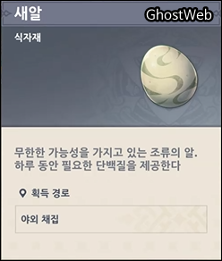 새알 획득 경로 : 야외 채집 음식 : 티바트 달걀 프라이, 장원 팬케익, 만족 샐러드, 명월 딤섬, 모험가 계란빵, 달빛 파이, 골든크랩, 연밥 계란찜 채집 위치 정리 : https://ghostweb.tistory.com/1122 |