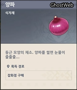 양파 획득 경로 : 잡화점 구매 (몬드 잡화점 블랑키, 리월항 영발 상점 동승) 음식 : 북극 훈제닭, 어부 토스트 |