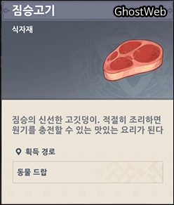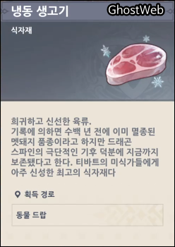 냉동 생고기 획득 경로 : 동물 드랍 요리 : 뜨끈 야채 스튜 식자재 : 짐승고기 |